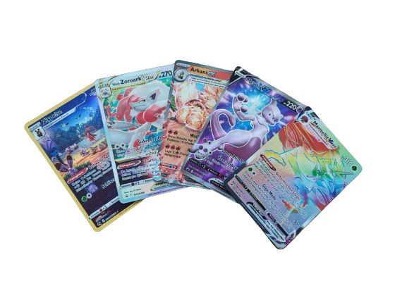 Es handelt sich um verschiedene "Fullart" Karten wie zb. V, Vstar, EX, Vmax, Strahlende Karten, Illustration rares, mit Glück sind auch Rainbow, Gold oder Alternative Art Rare Karten zu finden.